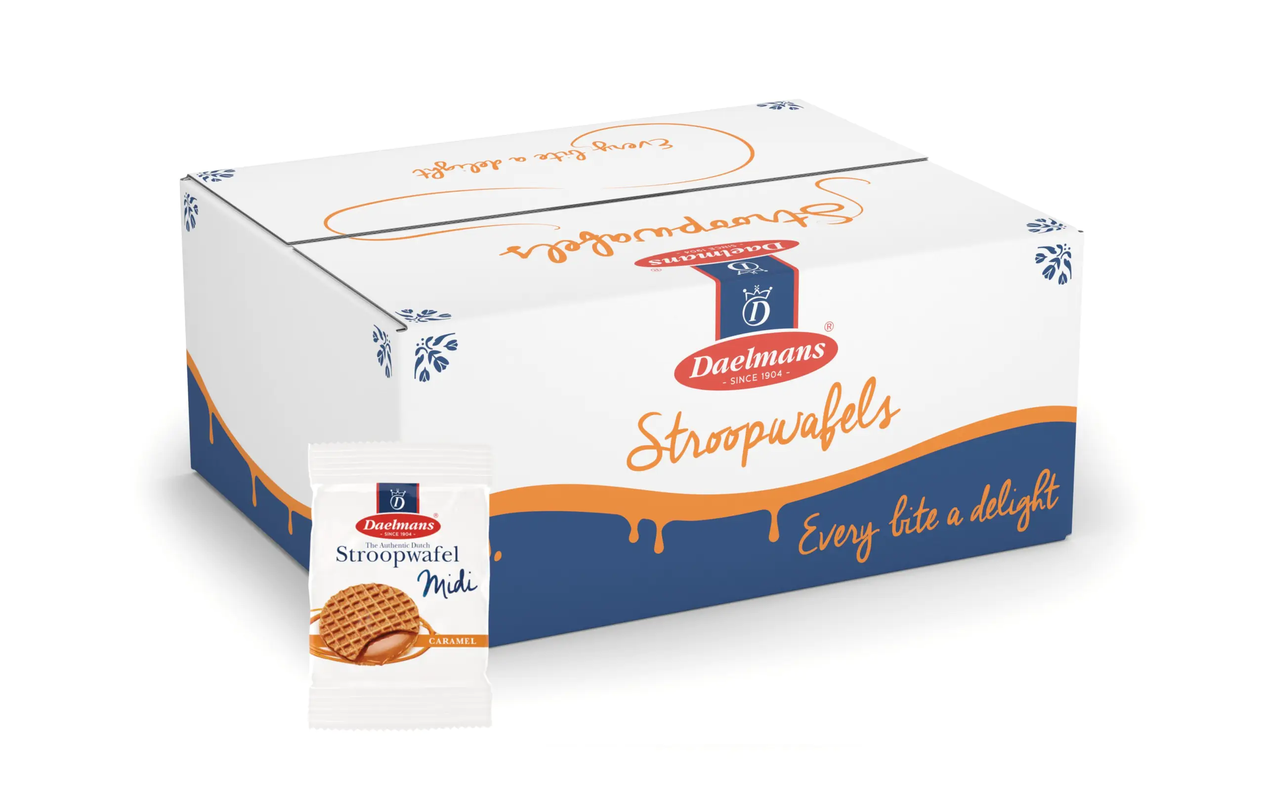 No less than 150 delicious Midi Caramel Stroopwafels, filled with a soft butter syrup filling enriched with Bourbon vanilla. The Stroopwafels, with a diameter of 6 cm, are individually wrapped. This makes them ideal for coffee or tea in catering establishments, at the office or just at home. This way you can give your guests a big smile on their face with a small gesture. Experience it yourself!